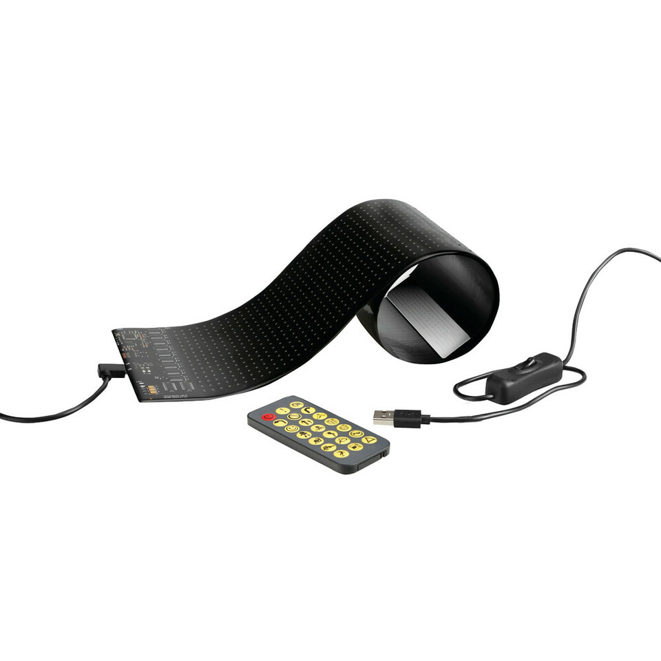 Ein schwarzes, flexibles Smart-LED Dekoschild mit Fernbedienung und USB-Kabel mit Schalter auf weißem Hintergrund.