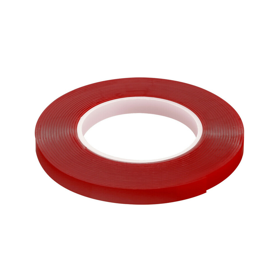 Rolle transparentes doppelseitiges Klebeband mit rotem Schutzfilm auf weißem Hintergrund.