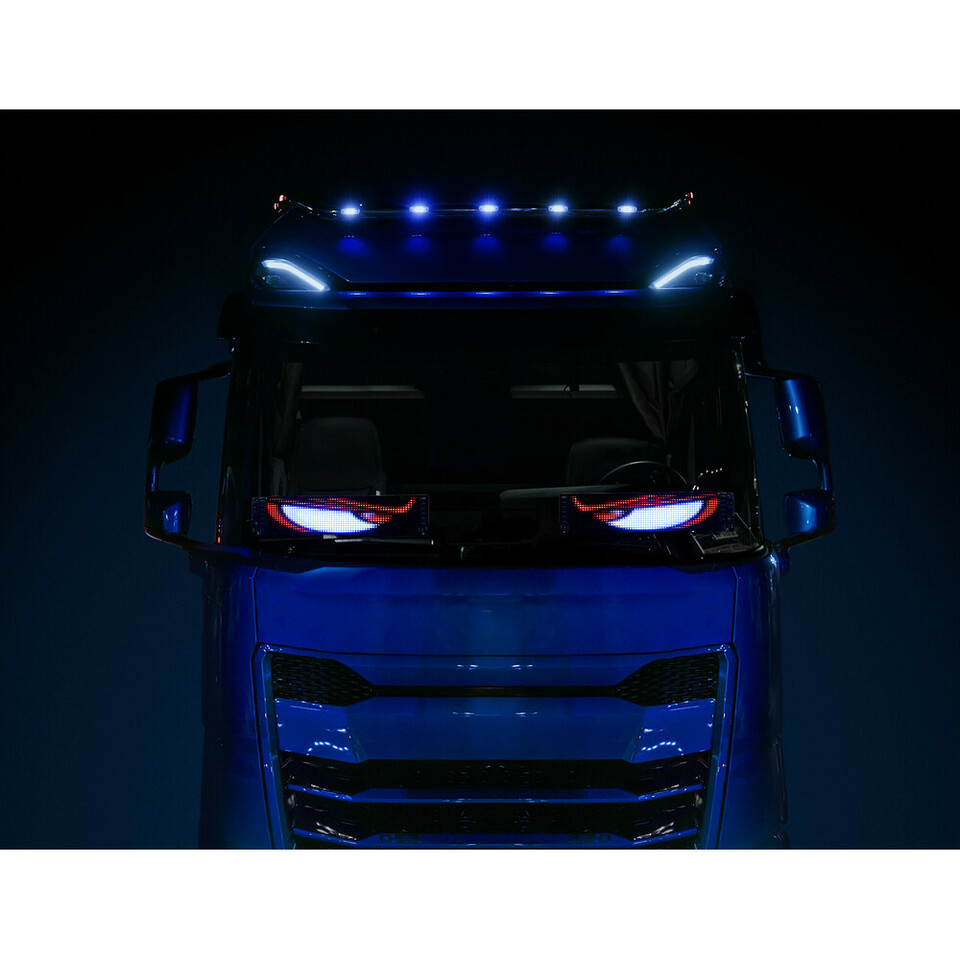 Frontansicht eines blauen LKWs bei Nacht, mit leuchtenden Smart-LED Dekoschildern im