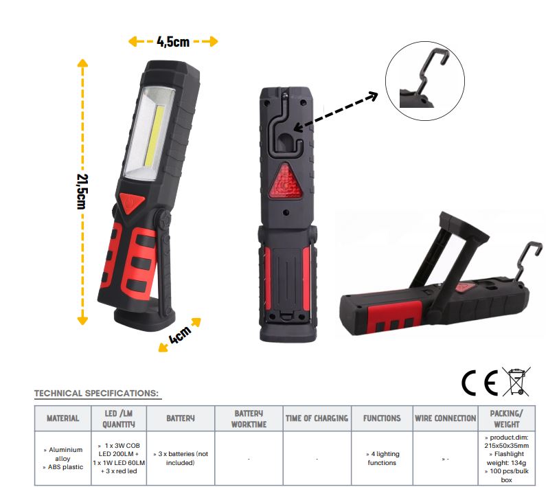 Schwarze Handtaschenlampe aus ABS-Kunststoff mit rotem Akzent, weißer LED, rotem Warnlicht, Halterung und Haken.