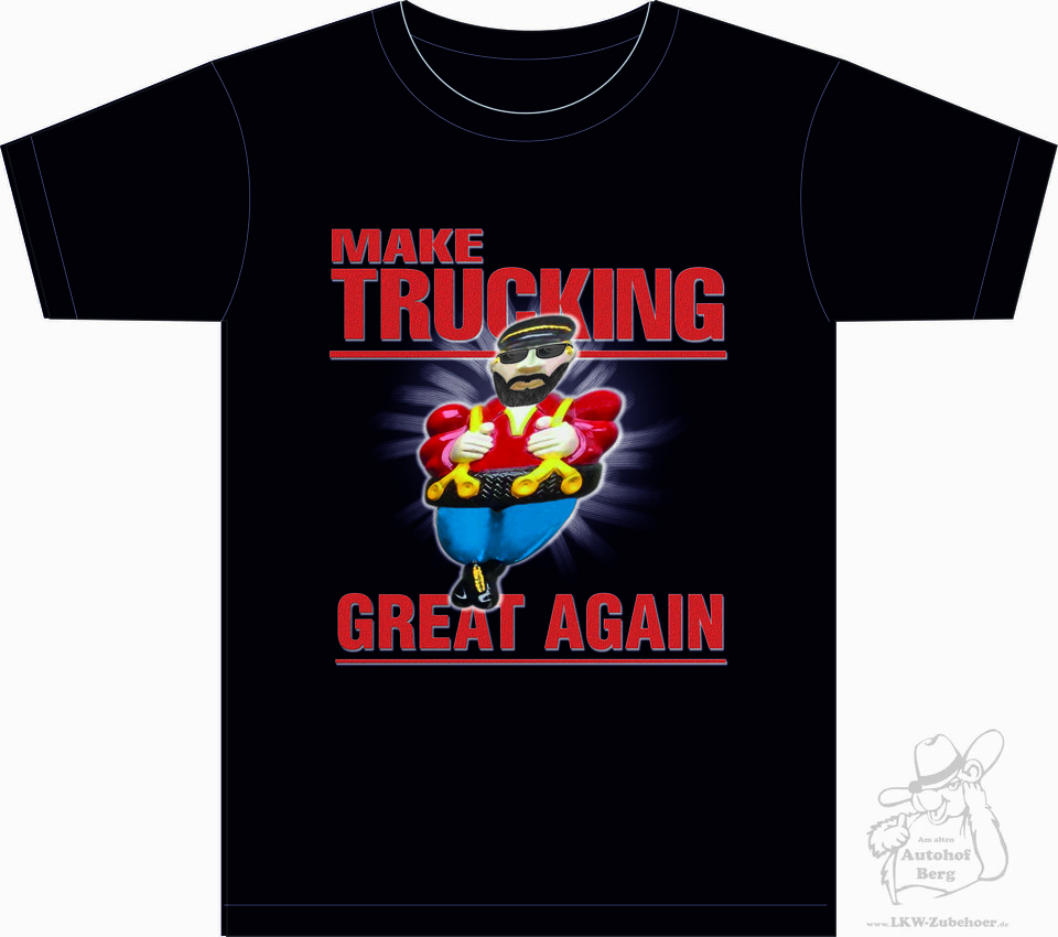 Schwarzes Baumwoll-T-Shirt mit rotem Aufdruck "MAKE TRUCKING GREAT AGAIN" und Cartoon-Trucker-Figur.