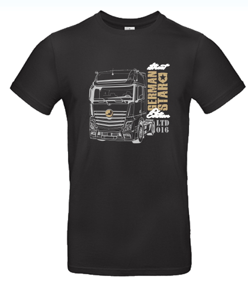 Schwarzes Baumwoll-T-Shirt mit weißem LKW-Motiv und goldfarbenem "German Star" Schriftzug.