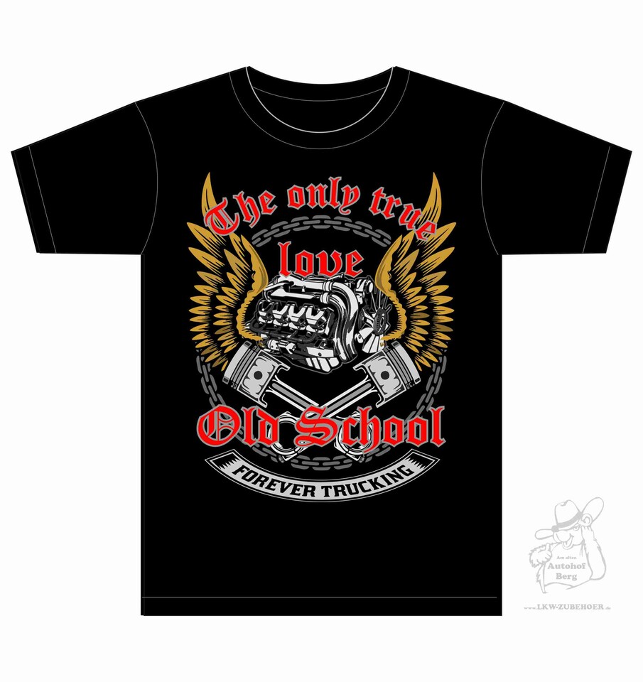 Schwarzes Baumwoll-T-Shirt mit großem, farbigem Aufdruck. Motiv: Motor mit Flügeln, Kolben und den Schriftzügen 'The only true love' und 'Old School'.