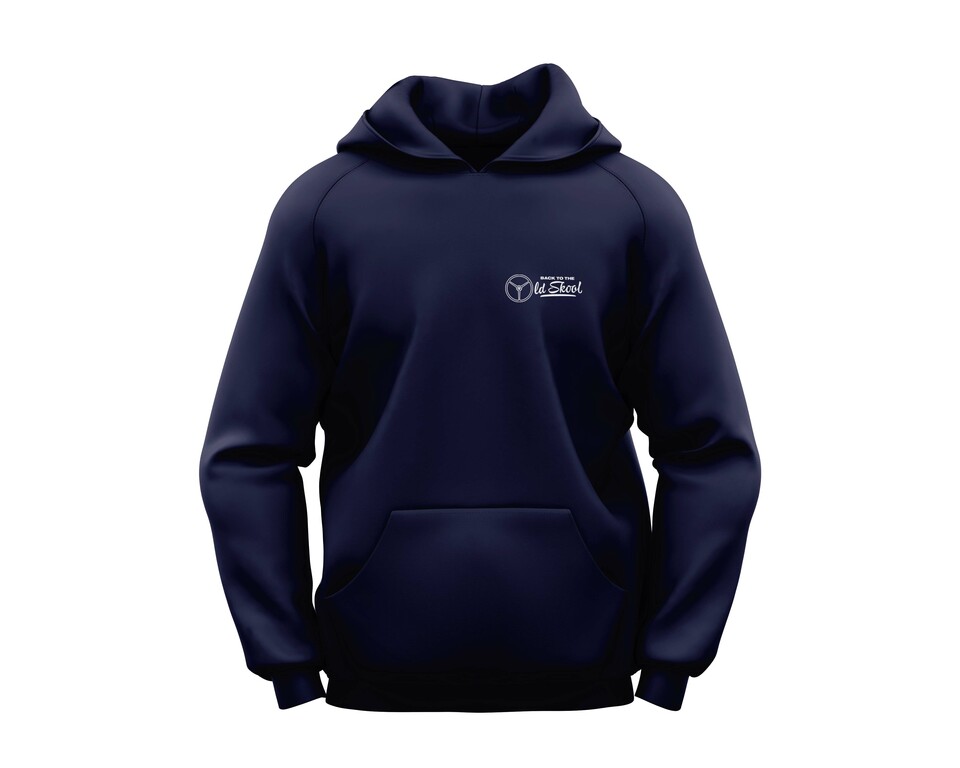 Dunkelblauer Scandi Hoodie von hinten mit großem "Old Skool" Druck, Lenkrad und NL-DE Flaggen.