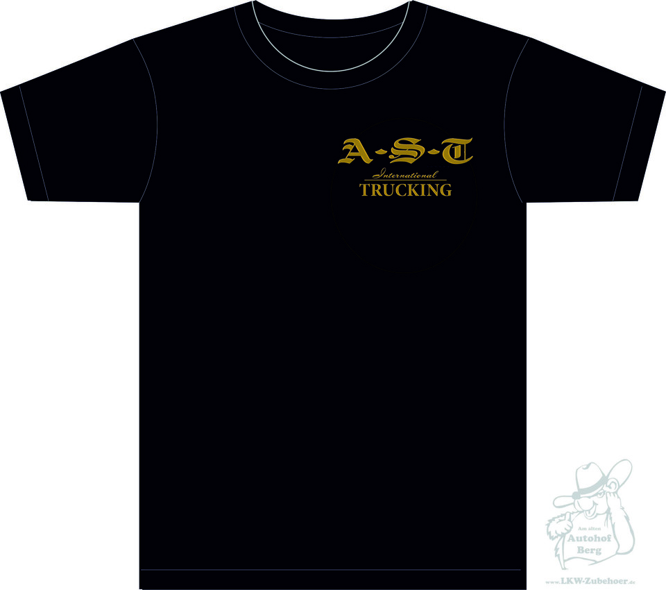 Schwarzes Fan Shirt mit goldenem Aufdruck 'A-S-T International TRUCKING'.