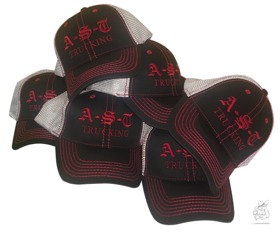 Mehrere schwarze Kappen mit grauem Netzstoff und roter Stickerei 'A-S-T TRUCKING'.