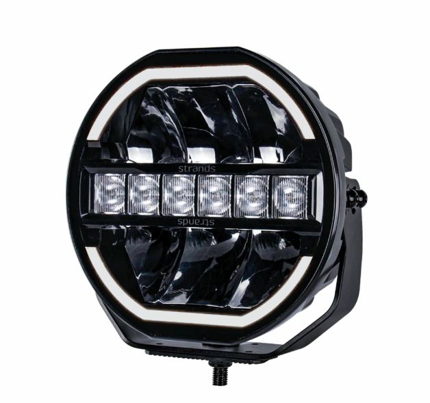 Runder, schwarzer Strands Siberia Skylord LED-Fernscheinwerfer mit weißer Ring-Positionsleuchte und zentralen LEDs.