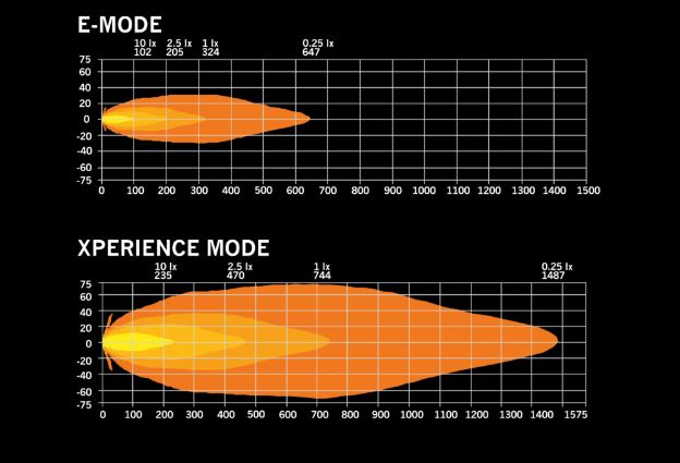 Diagramme zeigen die Lichtverteilung des Siberia Skylord Fernscheinwerfers in E-MODE und XPERIENCE MODE.
