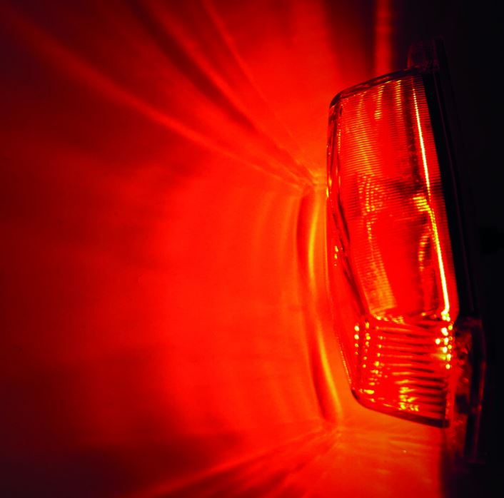 Leuchtende rote LED-Doppelbrenner-Lampe aus Kunststoff für LKW-Kühlergrill, wirft intensive rote Lichtstrahlen.