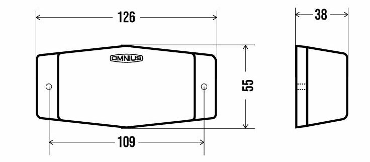 Technische Zeichnung der Omnius LED Double Burner Kühlergrilllampe von vorne und der Seite.