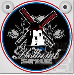 Runde schwarze Platte für Leuchtkasten mit Windmühlen-Design, Rosen und 'Holland Style' Schriftzug. Umrandung in Rot, Weiß, Blau.