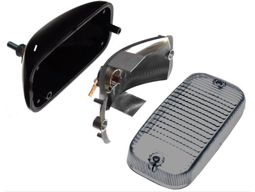 Zerlegtes Tagfahrlicht Talmu Schwedenleuchte mit schwarzem Gehäuse, Reflektor und dunkelweißem Ersatzglas.