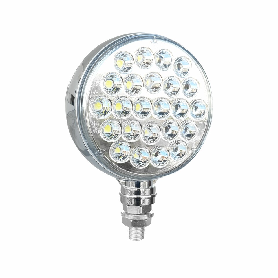 Runde LKW-Spiegellampe mit roten und weißen LEDs und Chromhalterung.