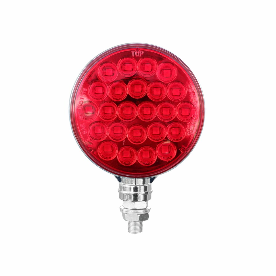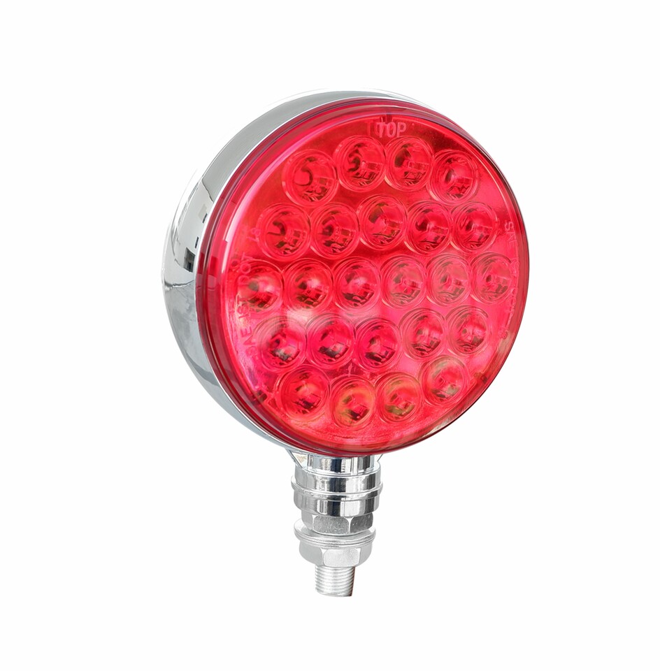 Runde Spiegellampe mit rotem Glas und mehreren roten LEDs. Chromgehäuse und Halterung. 'TOP' ist oben markiert.