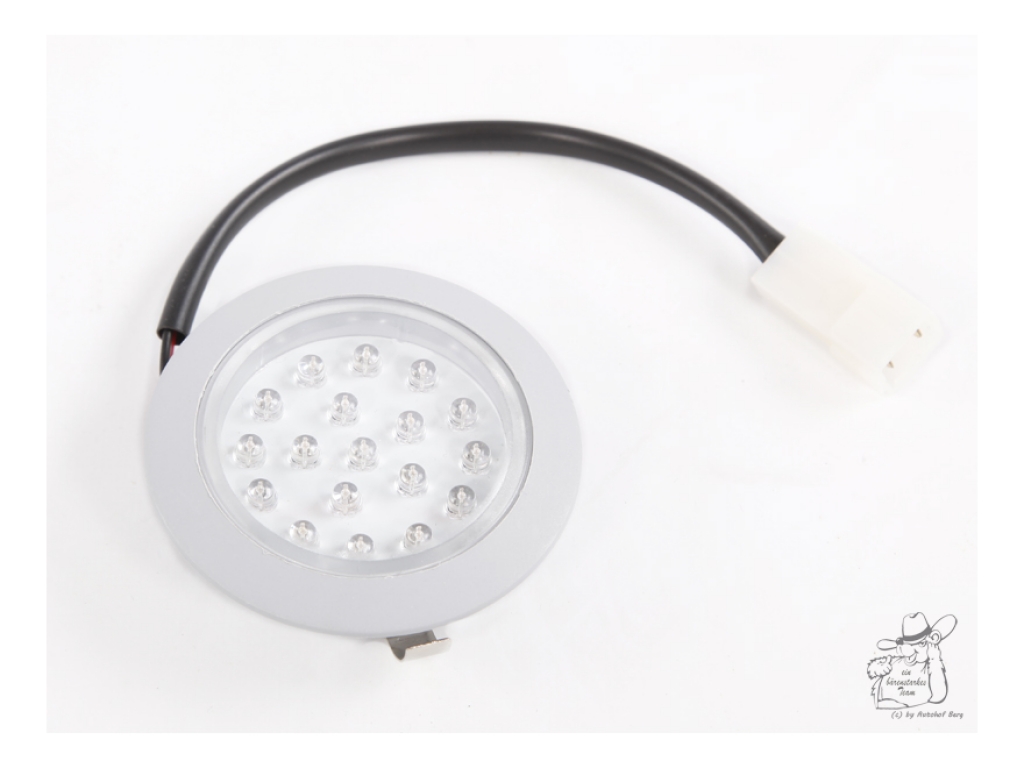 Runde LED Innenraumlampe mit silbernem Metallrahmen und blauer Leuchtfläche mit weißen LEDs.