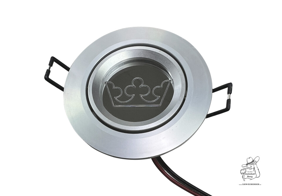 Runde Einbauleuchte mit Metallrahmen und eingraviertem Motiv einer Krone.