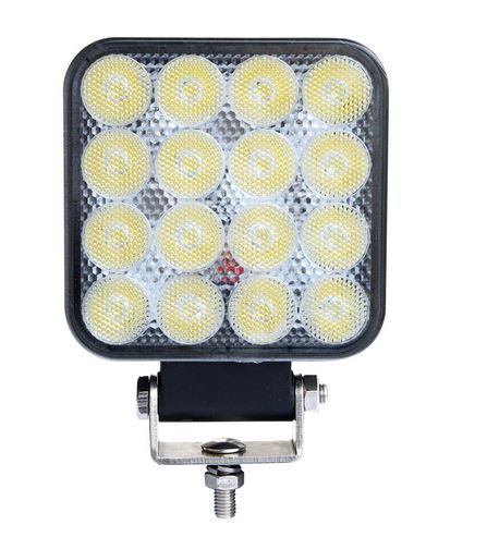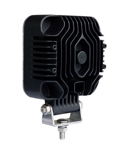 Quadratische LED Arbeitsleuchte mit dunklem Gehäuse, klarem Glas und mehreren gelblich-weißen LEDs. Inklusive Montagehalterung.