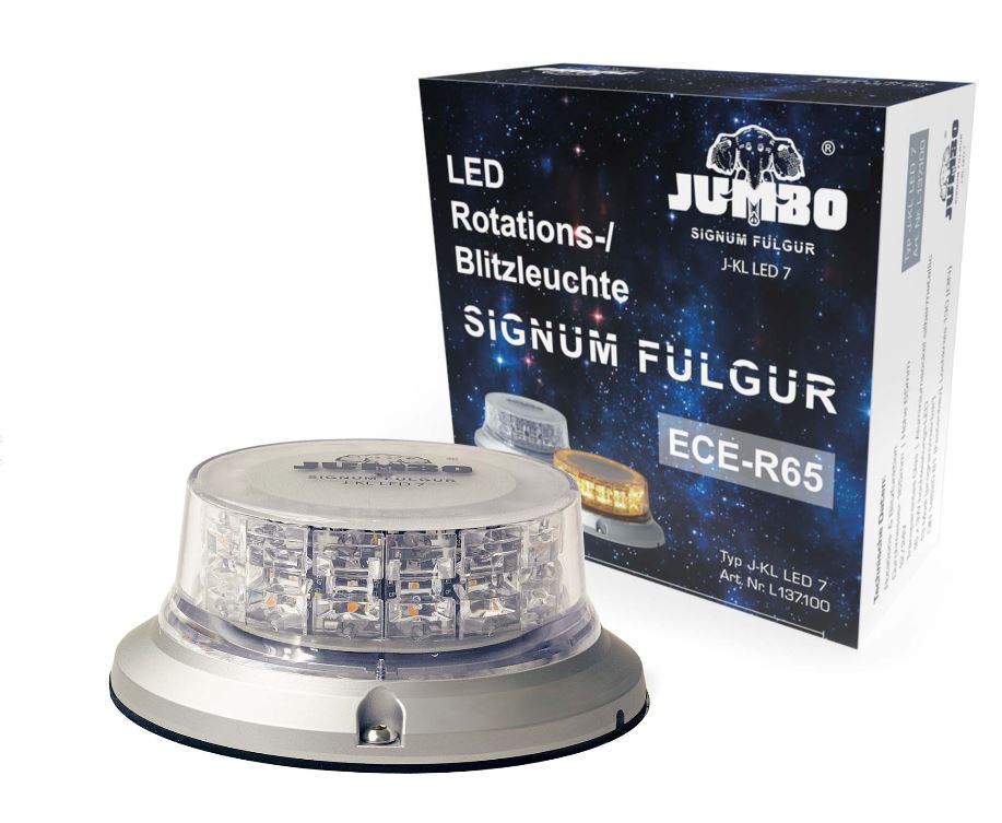 Jumbo J-KL LED Rotations-/Blitzleuchte mit transparentem Glas und silbernem Alusockel, daneben die Produktverpackung.