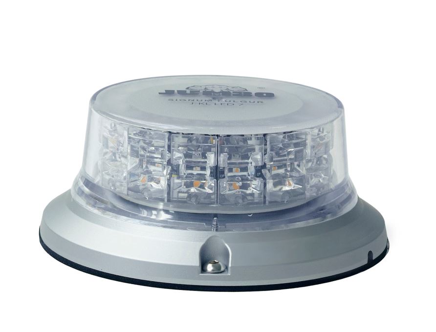 Rundumleuchte Jumbo J-KL LED 7 mit transparentem Glas und silbermetallicem Alusockel, zeigt LED-Module.