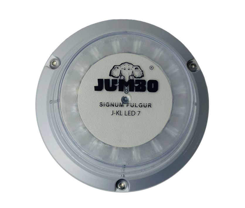 Runde Rundumleuchte Jumbo J-KL LED 7 mit transparentem Glas, silbernem Alusockel und mehreren LEDs.
