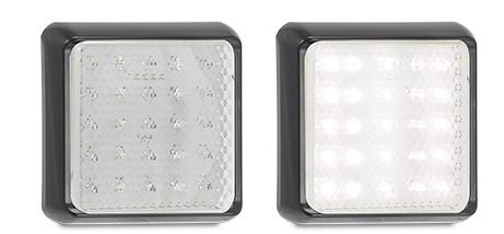 alt="Quadratische LED-Rückleuchte mit schwarzem Rahmen. Links ausgeschaltet, rechts leuchtend."