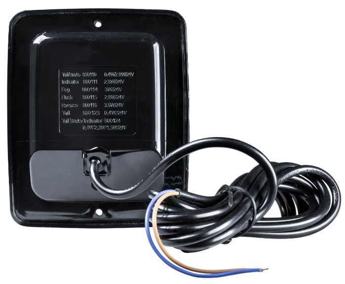 Rückseite der schwarzen, eckigen Strands DARK Knight Heckleuchte mit langem, aufgerolltem Anschlusskabel.