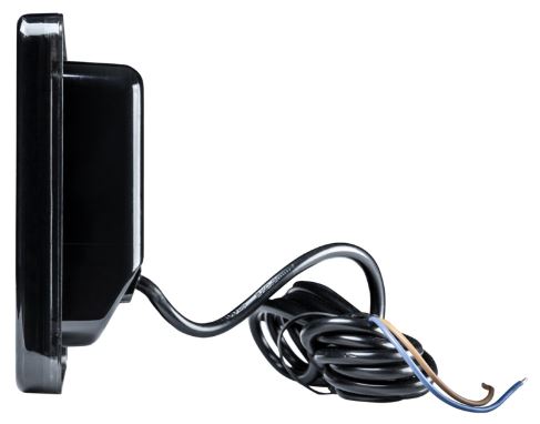Rückseite der schwarzen, eckigen Heckleuchte mit angeschlossenem Kabel und zwei farbigen Adern.