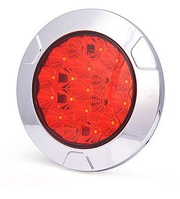 Runde rote Heckleuchte im Wabendesign mit LEDs und chromfarbenem Rand.