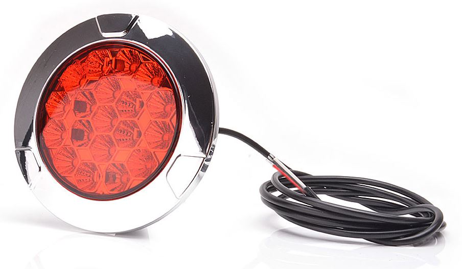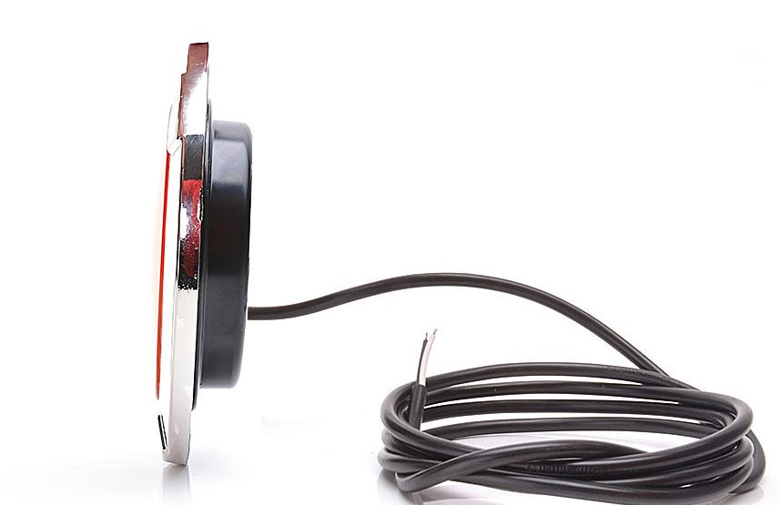 Seitenansicht einer runden Heckleuchte mit roter Linse, Chromrand und schwarzem Gehäuse. Dazu ein aufgerolltes Anschlusskabel.