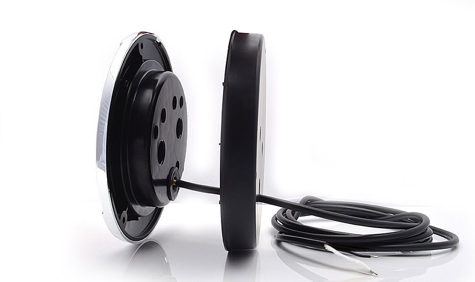 Runde schwarze LKW-Heckleuchte mit Chromrand und Anschlusskabel, von der Seite auf weißem Hintergrund.