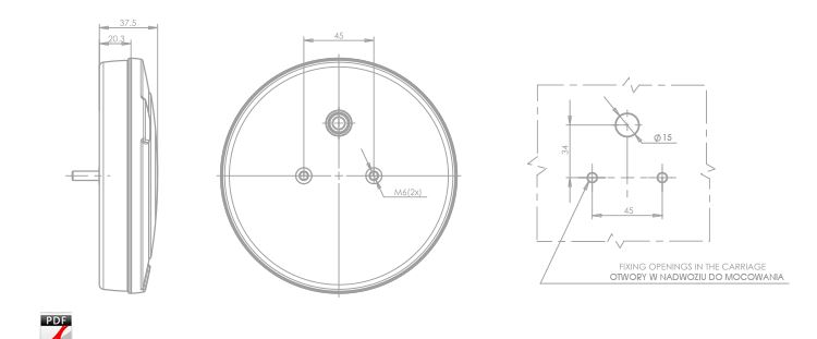 Technische Zeichnung der runden Heckleuchte im Wabendesign mit Ansichten und Befestigungsdetails.